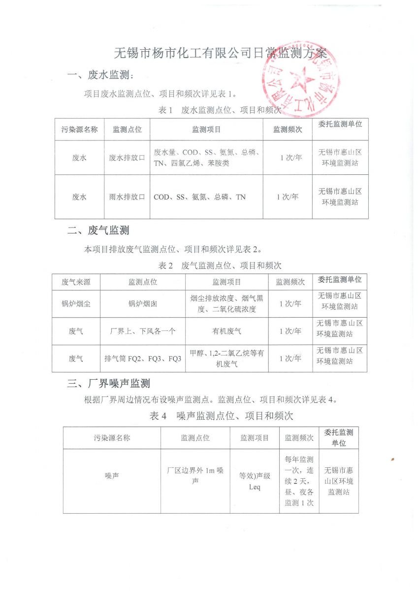 無錫市楊市化工有限公司日常監測方案
