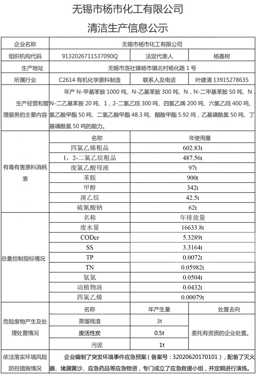無錫市楊市化工有限公司清潔生產信息公示